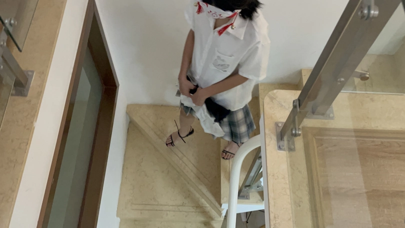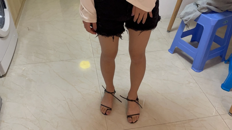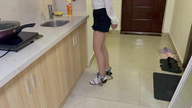室内,罗菱菱穿着日常的裙子,穿着黑色凉鞋(镜头开始是全身,然后放大,从上往下拍穿着鞋的脚的特写,约两分分钟)。然后小茜拿着短牛仔裤和白色T恤,去房间换上短牛仔裤和T恤,脚上穿着黑色凉鞋出现在镜头面前。(镜头移动。相机倾斜60度这样,拍大腿到脚的下半身部分,就是大腿和脚要同框。再镜头放大,特写穿鞋的脚)。然后坐凳子上,慢慢脱下凉鞋,穿上船袜,穿上运动鞋,戴上手铐和脚镣,来回走动一下。然后坐在凳子下,慢慢脱下一只脚的运动鞋和船袜,穿上凉鞋。再脱下另一只脚的运动鞋和船袜,穿上另一只脚的凉鞋。把手铐打开,双手背在后面,走来走去,拿起手机,玩一下手机(镜头多拍一下模特穿着凉鞋的脚,多拍一下下半身部分)。