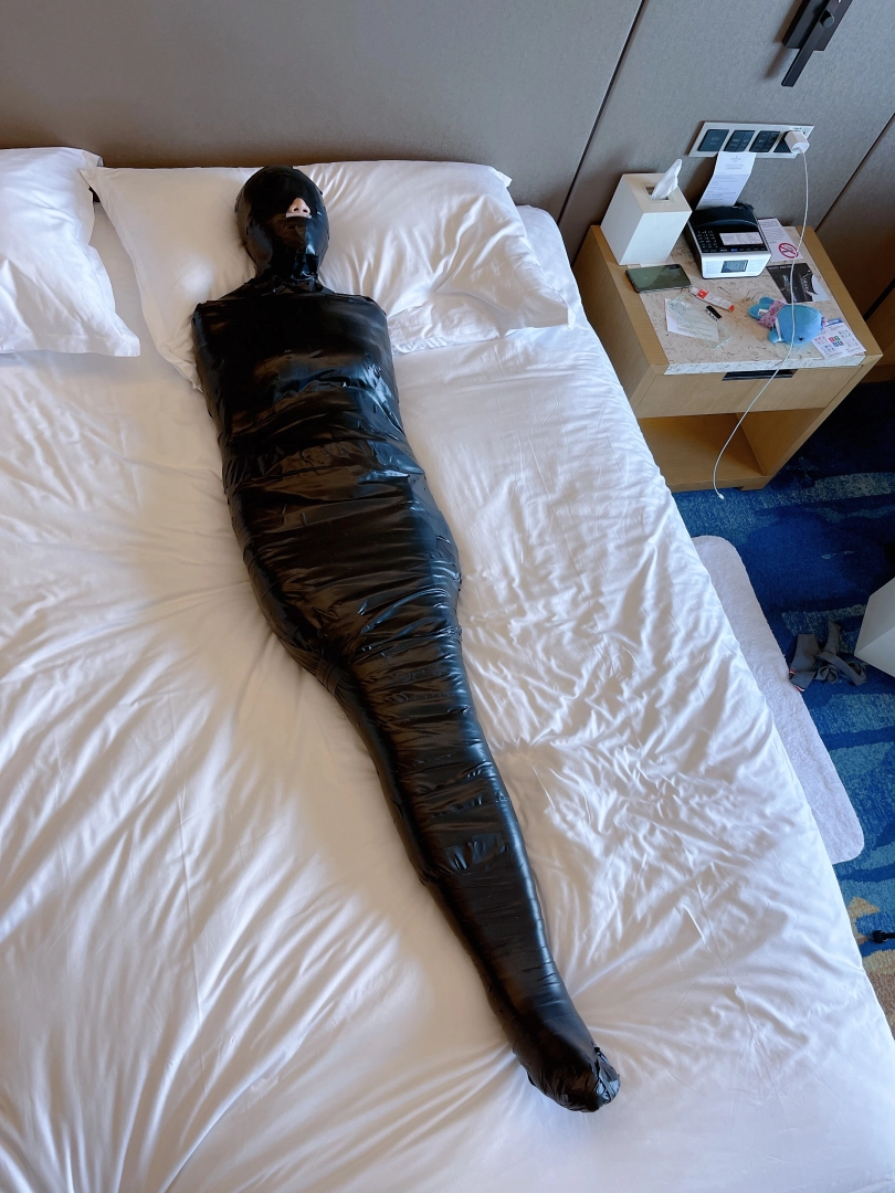 首先用保鲜膜和胶带把茶茶绑成木乃伊,绝对拘束没有一丝一毫脱出的可能。可爱的少女茶茶就这样从人变成了一个物品,只能静静放置着。娇小可爱的身体被黑色胶带包裹后更加像一个可爱的艺术品一样。