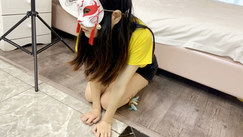 让可心裸足跪在卧室地上命令可心跪着爬到鞋架把杏色凉鞋拿起来放在地上,然后拿起两只凉鞋爬回卧室。