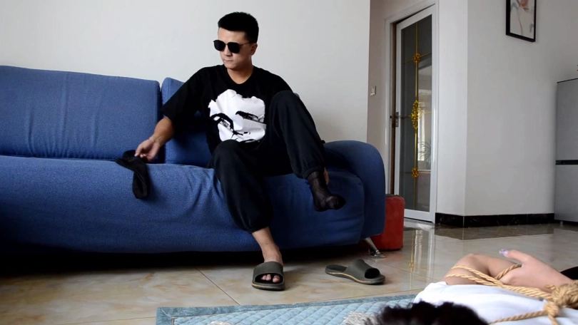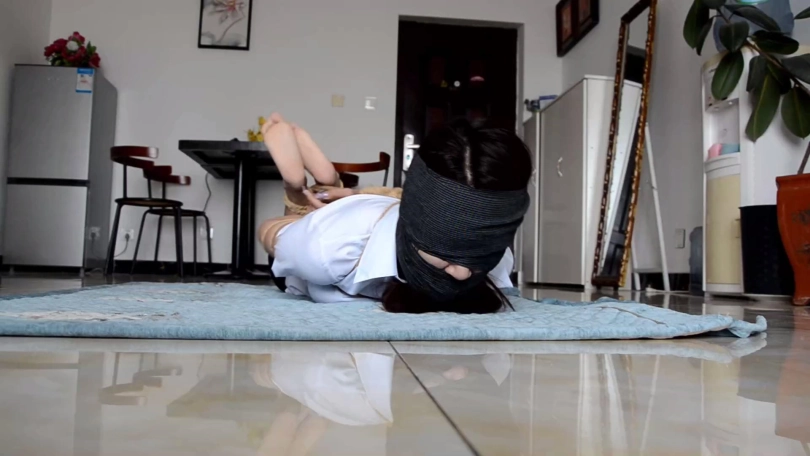 独自在家的女孩(瑾萱饰)在家遭遇歹人抢劫,歹人将女孩上身五花大绑后捆绑其双腿和脚踝,拽出女孩口中塞口球,强行塞入从女孩脚上扒掉的两只肉色短丝袜。