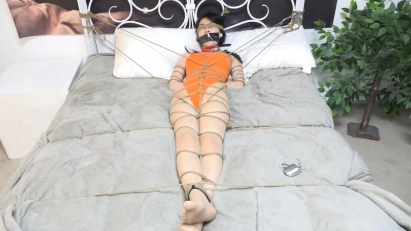 RF的嘴巴被塞进了口球,外面用胶带封住,眼睛用绳子蒙住,耳朵被塞进有线耳机阻断听觉;脖子上带好项圈,用铁链锁在床上;她的双臂与上半身固定在一起,双手带上手铐压在身下,双腿维持之前的捆绑不变,只是双脚交叉叠放,脚腕被戴上了脚铐,再绑在一起。醒来的RF尝试挣扎,呻吟。