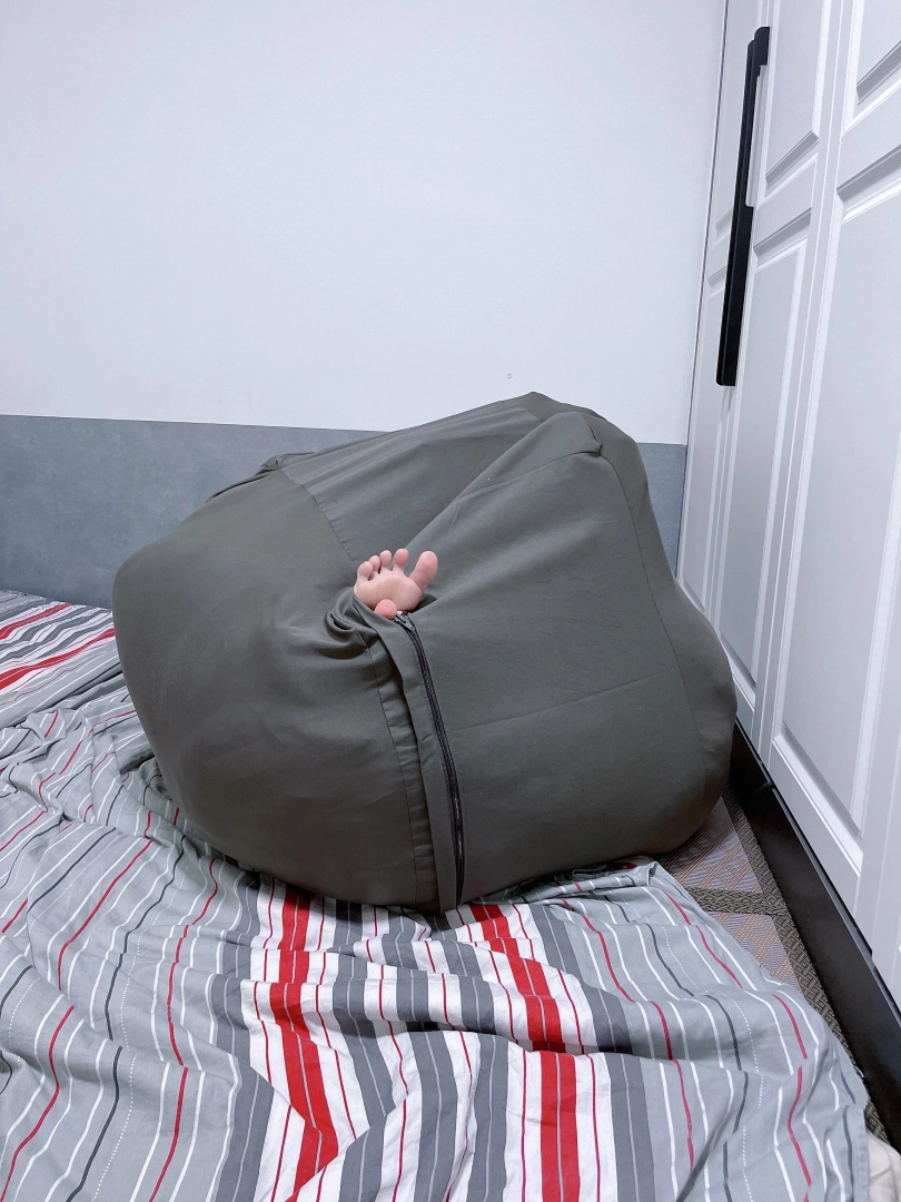 先买一个懒人沙发套,往里面填充一个双人棉被之后命令茶茶钻进袋子里。钻进袋子后继续往袋子里填充枕头、衣服等填充物,直到袋子被填满成一个鼓鼓囊囊的正方体布团。