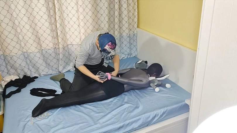 妹子在家分别穿上灰色和黑色Zentai玩,然后被183猛男用很多超紧黑色后丝袜完美包裹,无情的厚实亮黑丝袜来回单手套全包外加超紧丝袜睡袋,按摩调教,难受,长时间无助挣扎最后没有力气躺尸放置!本片为上下两集合体发售,包含很多元素!超值,包括部分按摩失禁镜头,有些为定拍版权镜头不能发表。多层厚丝袜拍摄不易,面部多层压迫难受,妹子比较娇气!喜欢的下,多视角远近镜头看个过瘾。