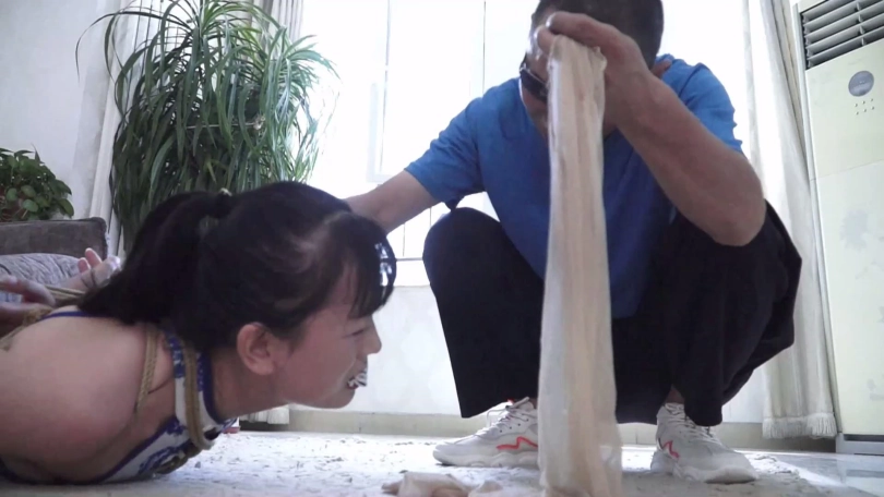 在二女一筹莫展之际锁哥得意洋洋出来,说我捆绑手法不错吧,你们没那么容易挣脱开,现在还有点时间还玩吗,二女拼命摇头表示放弃希望锁哥解开,可锁哥哈哈一笑说你们不想玩了,我还没玩够呢!锁哥将二女捆成驷马放置在沙发前地上,并表示打赌游戏二女输了,就得接受自己的惩罚。