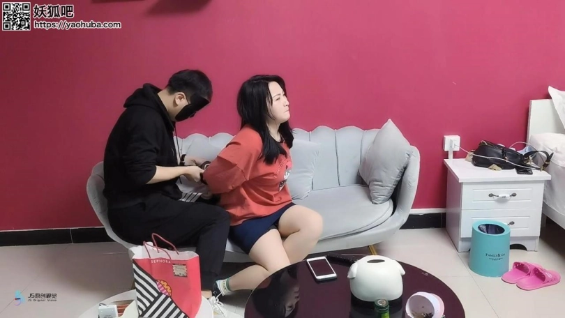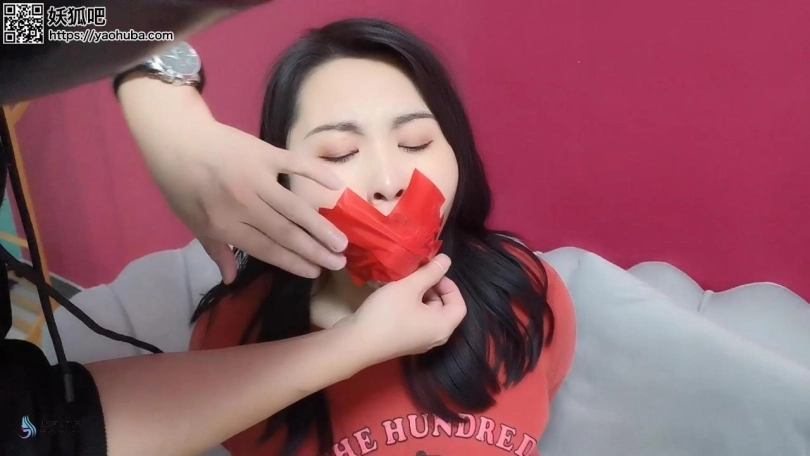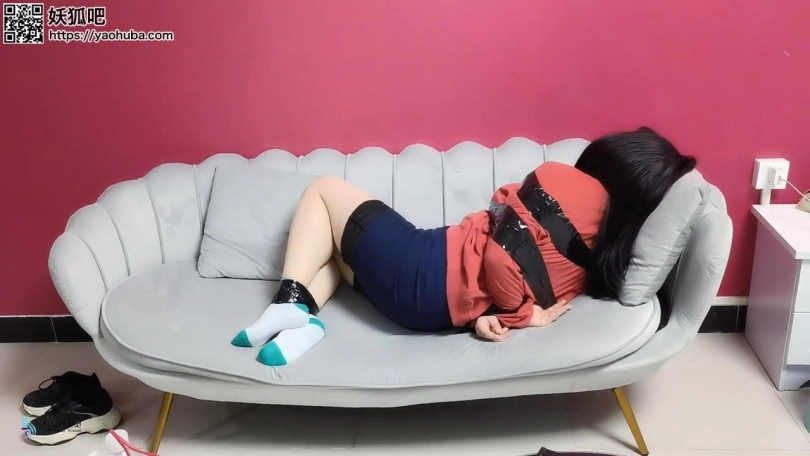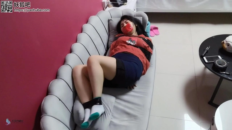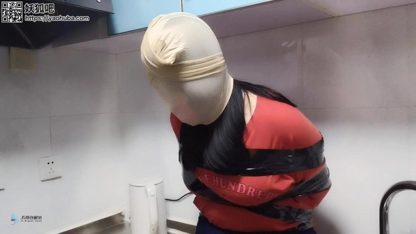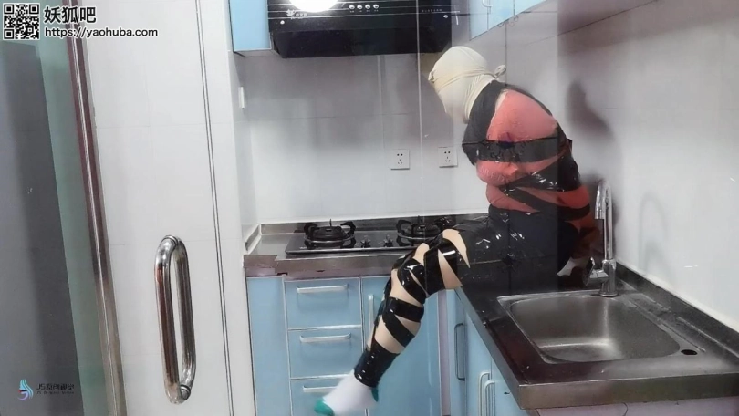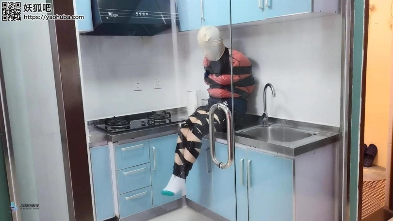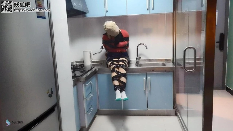歹徒入室潜伏,等妹子回家突然袭击控制妹子;第一段为胶带捆绑手脚,毛巾塞嘴,胶带封堵;第二段为丝袜套头,全身胶带紧密捆绑,放置在厨房间内挣扎。