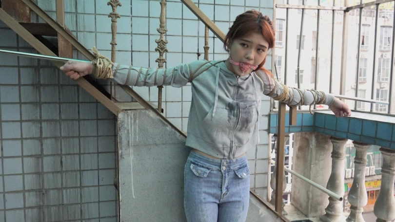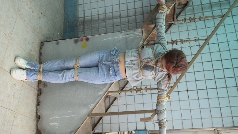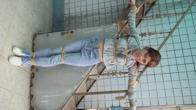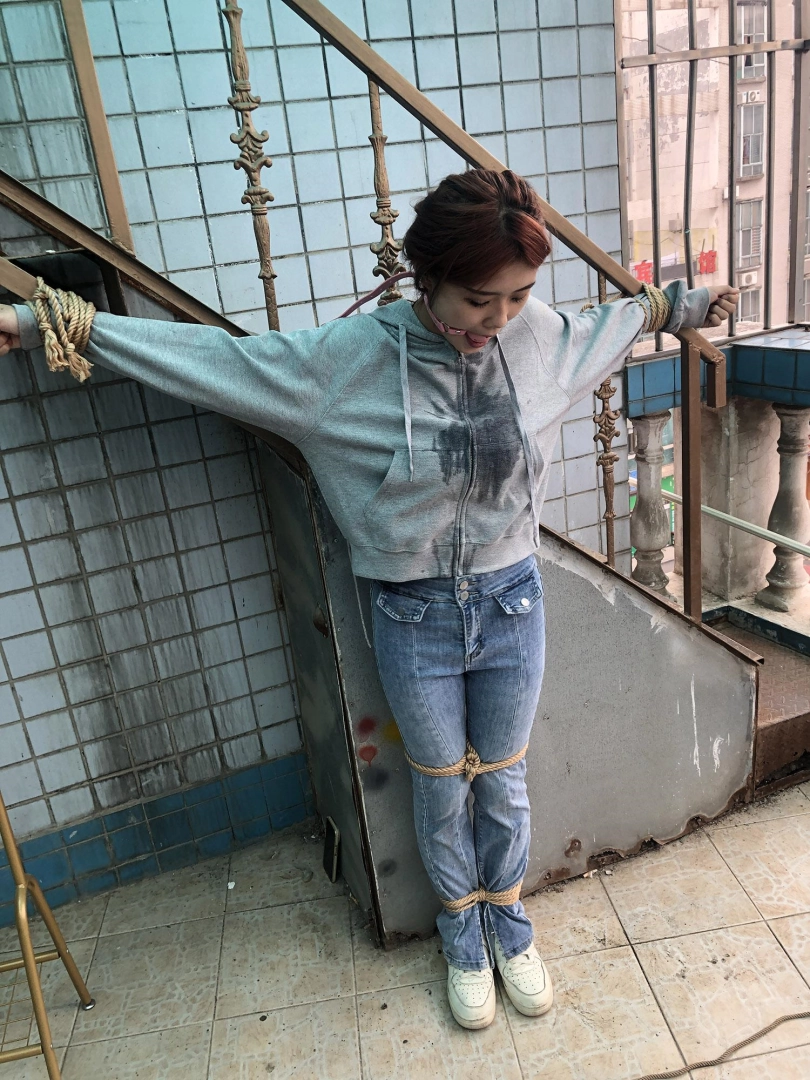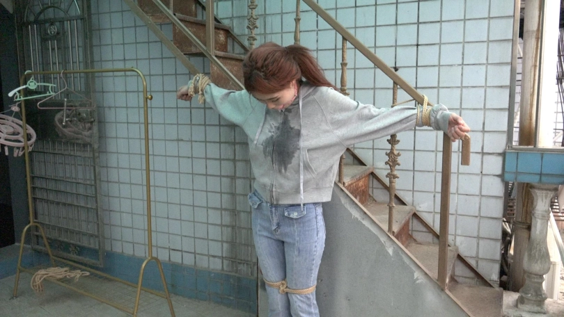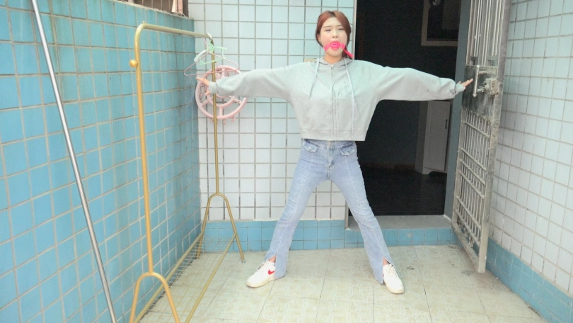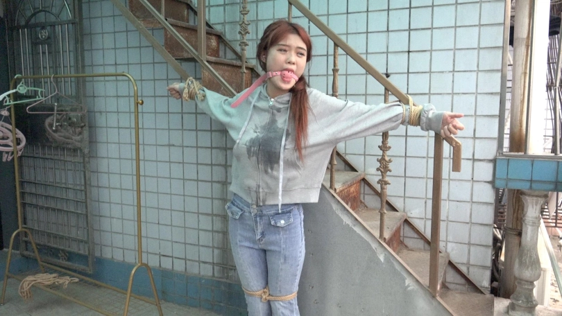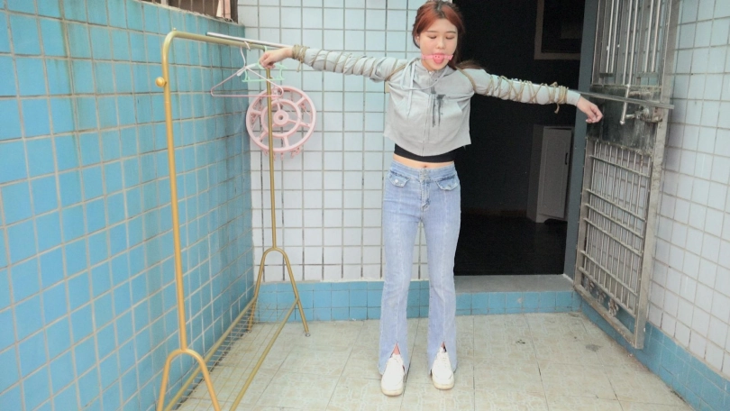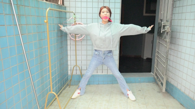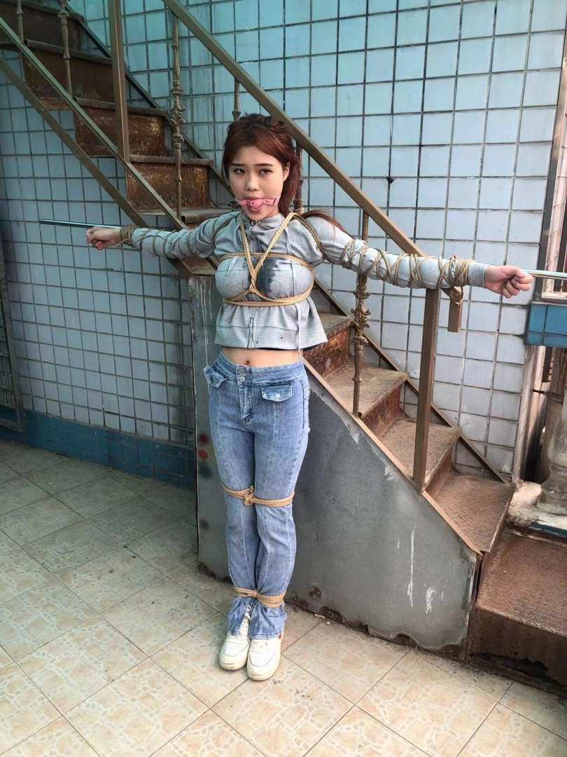 男子拿来一个长杆,将娜娜的双手手腕分别固定在长杆两端,双腿则并拢捆绑(口球不摘,一直戴着)。接着,男子将长杆用绳子固定在一个地方,这么一来,娜娜便被呈十字形拘束在那里。