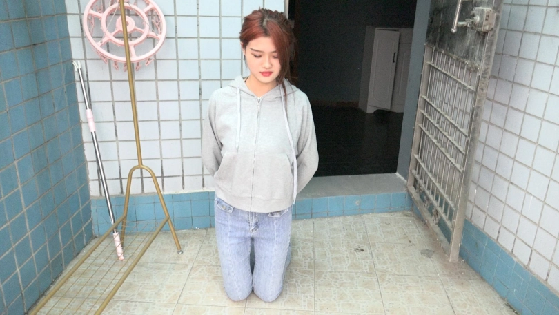 男子打量着娜娜的动作,脸上浮现出邪恶的神情。她开始纠正娜娜的动作,并要求娜娜将五指并拢伸直,指尖要翘起来。并且胸要挺出来,双脚并拢(体罚过程拍全身)。