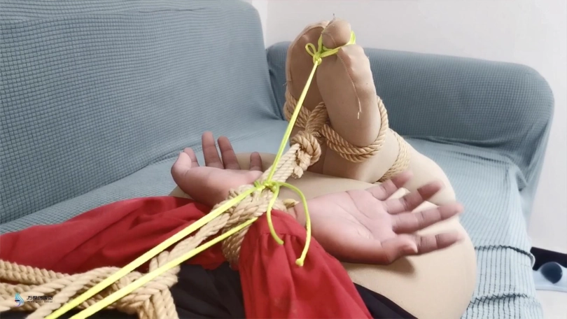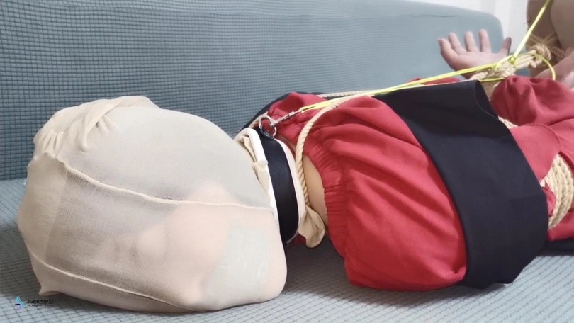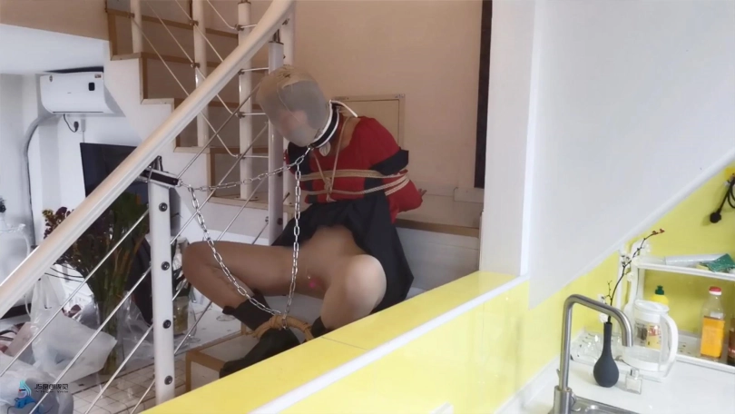 劫匪用脖套戴在她脖子上,另一头拴在栏杆上,把林洛固定在那里。嘴巴被胶带封住,并用丝袜套头。在她的下面放了一枚TD不断震着。琳洛被渐渐袭来的[X_X]刺激着,不断的呻吟。脱掉她的短靴,将她驷马捆绑在沙发上。连脚趾都没放过绑上,可爱的丝袜脚丫不断的扭动着。。。