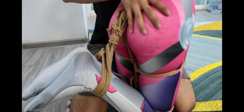 第一幕雨晨跪在地上,腿脚连着股绳,上半身吊起来,接着坏人开始玩弄她(摸胸,打屁股,拉股绳,挠脚心)此处雨晨被棉袜堵嘴,透明胶带封住嘴巴。发出呜呜呜。