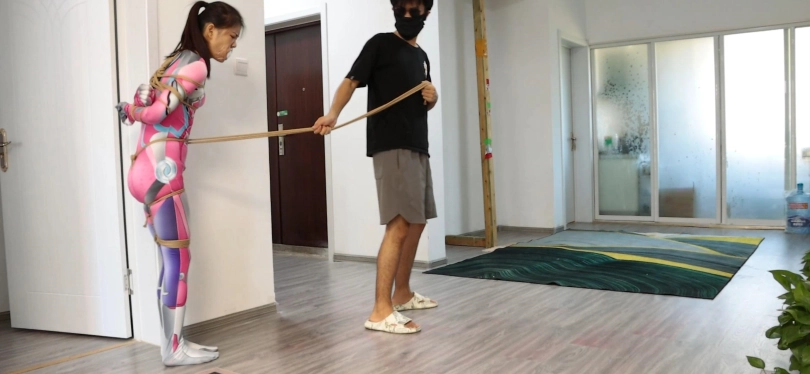 坏人撕开雨晨嘴巴的胶带,掏出那双厚厚的袜子,没等雨晨说话,又将一双白色棉袜塞入她的嘴巴里让嘴巴鼓起来后,用透明胶带将嘴巴封上。接着用一根绳子连接她的股绳,将雨晨牵出客厅,来到吊环下,对她进行控制并玩弄。