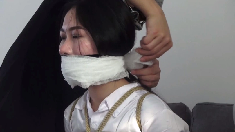 片段1:模特亚男被一双肉色连裤丝袜和一双肉色短丝袜塞嘴,再用一条肉色连裤丝袜勒嘴,嘴外被透明胶布封住,外面再用黑色静电胶带和白色纱布缠绕封住。