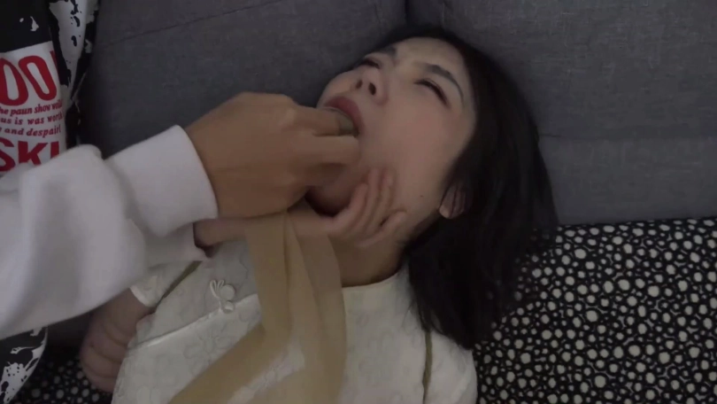 片段7:模特吴晗被一双黑色连裤丝袜塞满嘴,嘴外被蓝色自粘绷带缠绕封住。