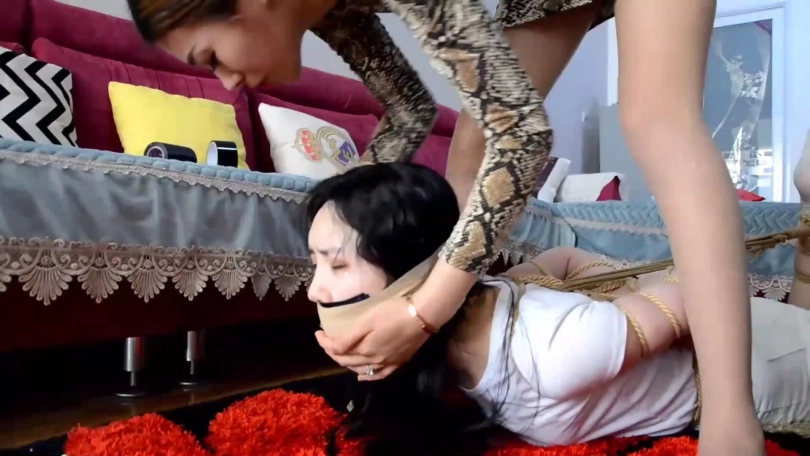 片段10:模特家欣和模特亚男分别被一双原味肉色锦纶丝袜和一双脏肉色连裤丝袜塞满嘴,嘴外被黑色电工胶布封紧,并被黄色静电胶带与黑色弹力自粘绷带缠绕封嘴。