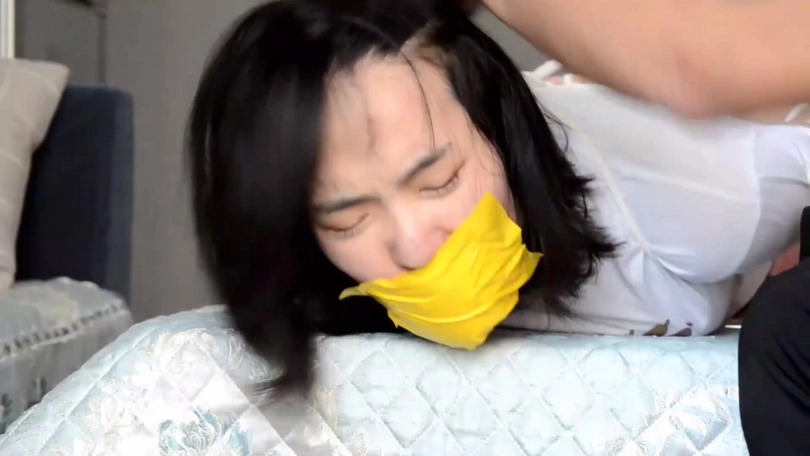 片段9:模特王仟雅被一双原味脏黑色锦纶丝袜塞满嘴,嘴外被紫色电工胶布封住,并被黄色静电胶带与黑色自粘绷带缠绕封嘴。