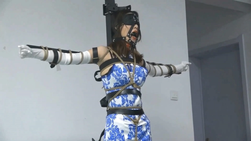 下集紧缚感继续升级,绳子和皮带一齐用上,全身只有双手还能挣扎。戴上眼罩和马具式口球后只能小姐姐只能唔唔叫,口水不断。