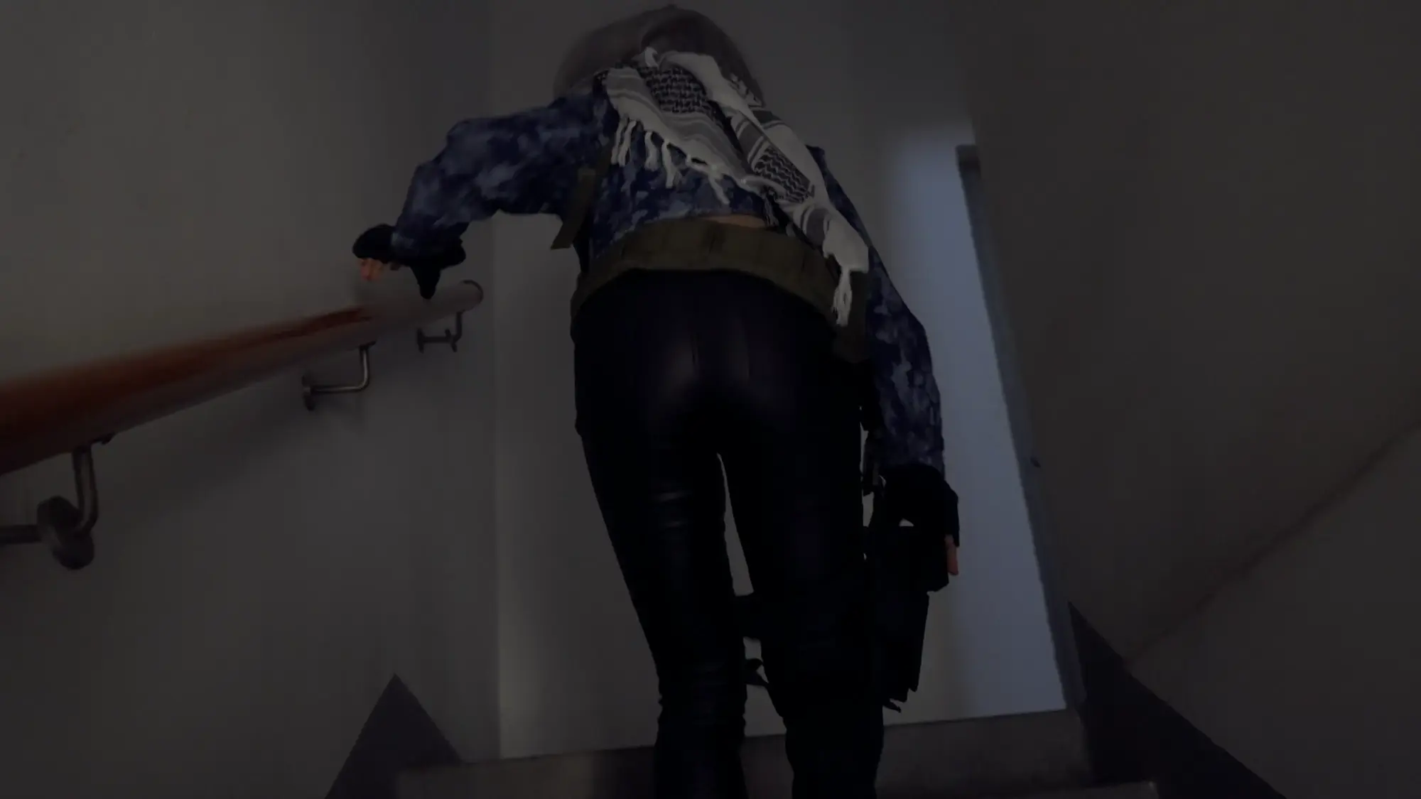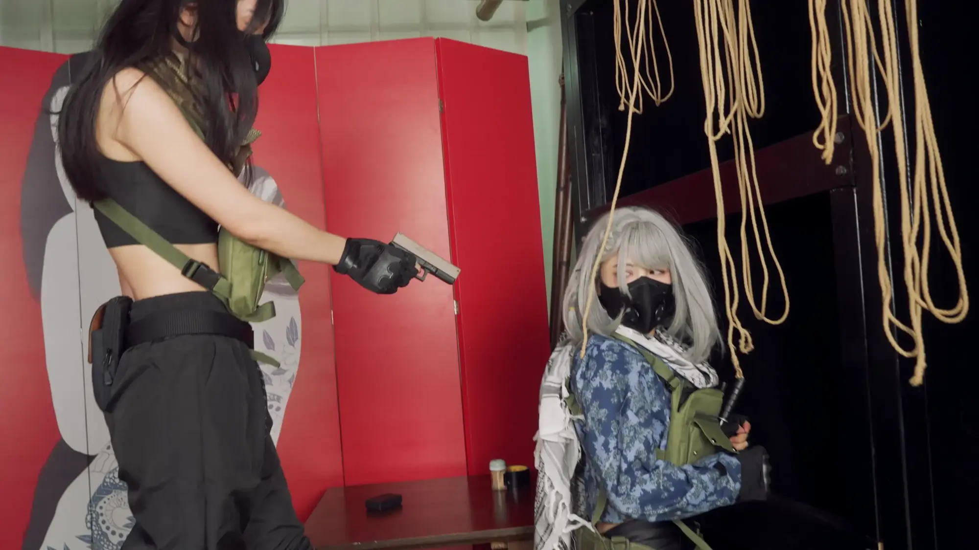 剧情这次也很简单,小0扮演的麦晓雯日常跑刀搜刮物资,运气爆表捡到了非洲之心,正当她准备撤离的时候,被嗷嗷扮演的露娜抓住,露娜夺走了非洲之心,并将麦小鼠单腿吊缚起来各种玩弄,正当露娜玩的开心的时候,一旁的小兵听到动静,举枪治服了露娜,也将她捆了起来。