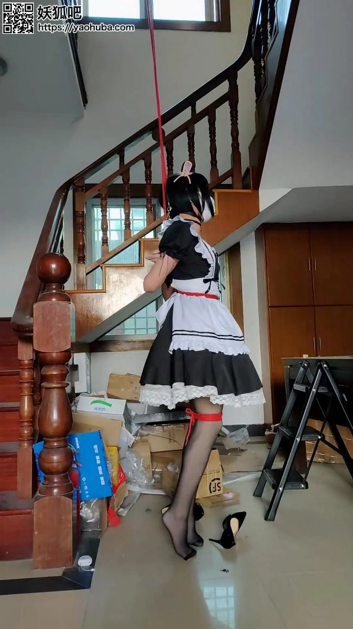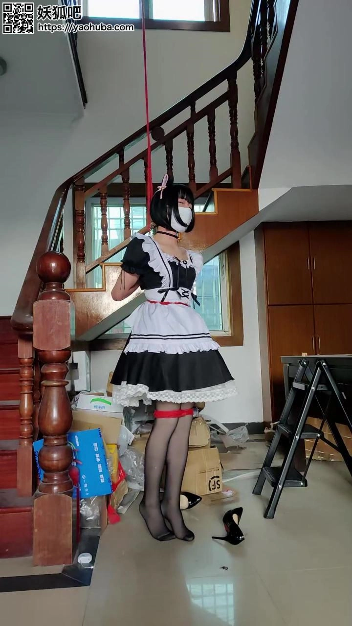 算是纯捆绑挣扎吧,前后有吊起和解脱的过程,最后解脱的时候出了点小意外,定时锁已经解开了,但是因为双手在背后吊得太高,居然没办法直接用手把手铐打开……还好垫脚的梯子还能够到,不然可就惨了……