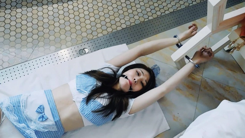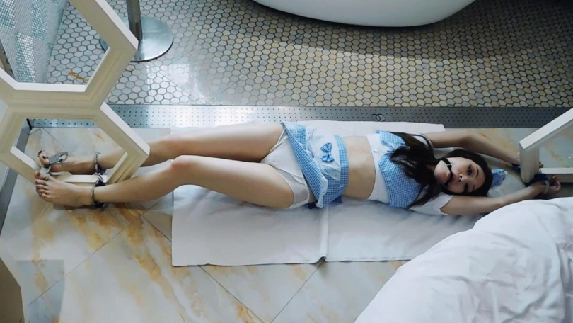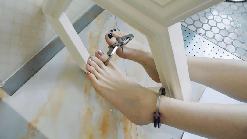 女仆平时在家里都带着脚镣,在打扫卫生。无意间看到主人的电脑还在开机,于是停下手头的工作,在玩电脑。主人悄悄地回来了,结果发现女仆正在偷懒,玩自己的电脑,十分生气,呵斥女仆。主人脱下她的鞋袜,锁上脚趾铐,让女仆跪下,解开手铐锁在背后,手脚用脚镣链接,让她跪下反思,然后离开。女仆见到主人生气,很害怕,一直在认错,哭了出来。主人回来了,还是很生气,解开镣铐,脱下衣服只剩内衣,让女仆躺在床上和椅子上,手穿过栏杆铐上,脚也穿过另一对栏杆铐上,脚趾铐住,把钥匙锁在一只脚趾上,带上口球然后离开。女仆一直扭动身体挣扎,想够到钥匙却不行,想说话也不行,十分难受。主人回来了,决定惩罚女仆,于是开始挠脚心。女仆十分难受却说不出话来,使劲求饶。最后主人决定原谅她,解开镣铐。但是决定以后不让穿鞋了,又加上脚趾铐工作,又都给锁上。妹子光着脚工作,打扫卫生,连脚趾也被锁了,十分不便。