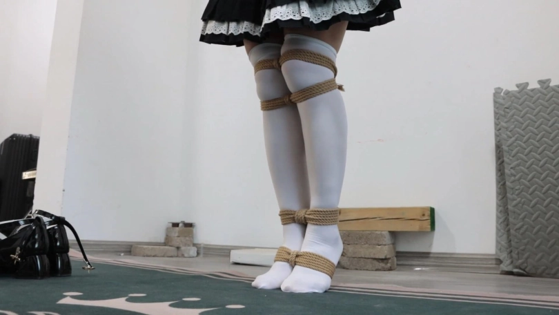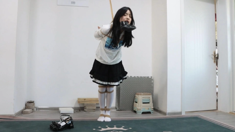 ——绮娜:耶!脚脚也被捆绑起来啦! 妹妹去大门处拿一下鞋子,哥哥等等哦。