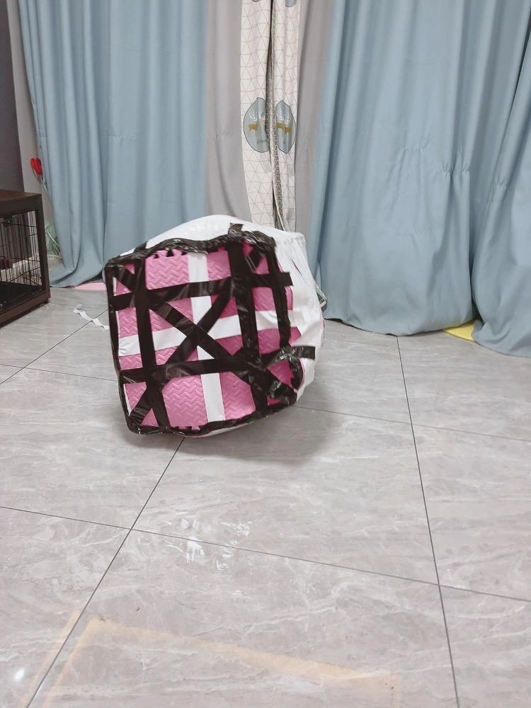 当然,牢固上也不能放过:在箱子内侧每条接缝处用布基胶带封好加固、然后在箱体外侧的4个面用布基胶带仔细包裹每一个角落,头顶的盖子在茶茶进入后用布基胶带多道加固,先X型贴胶带加固,然后横竖多道分别加固,保证牢固。