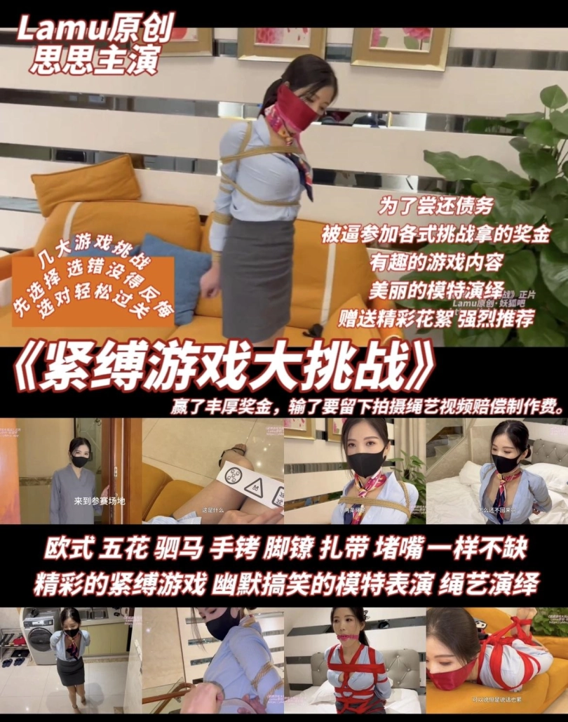 游戏正式开始!先选择,再告诉思思游戏内容,看思思能不能过关!内容都是一些我们熟悉的玩法,具体看预告片吧,我也不多介绍,留点神秘感给各位。最后思思肯定是不会挑战成功的(因为小伙伴这次下手很重),结果就是思思要留下来继续拍摄绳艺视频,以尝还制作成本。