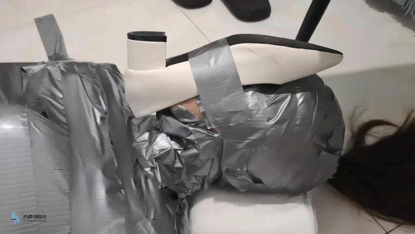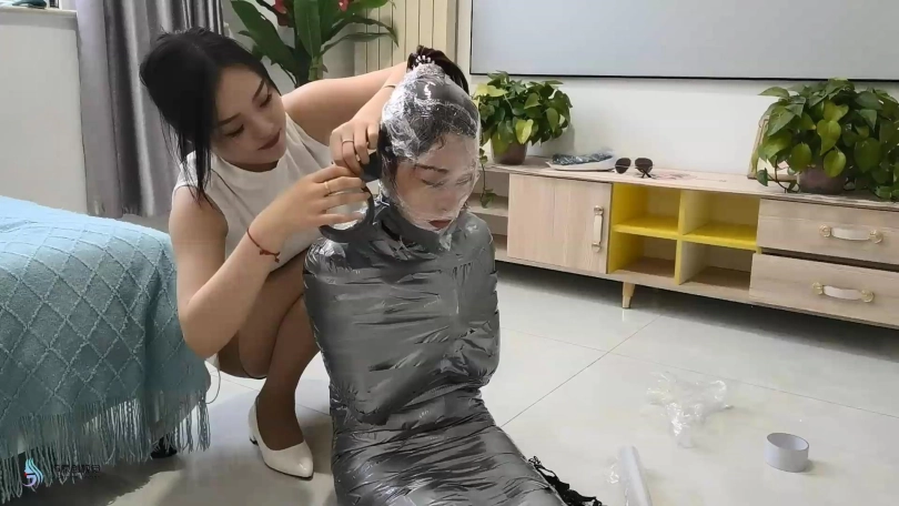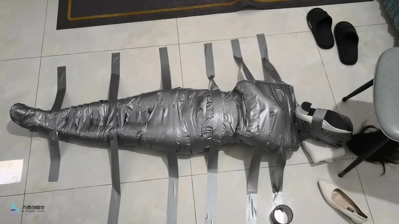 你把她放在地板上,拿出许多卷胶带。你脱下她的高跟鞋。她可以穿长衣服/连裤袜,以确保它不会粘在她的皮肤上。你用胶带把她的整个身体做成木乃伊,确保它尽可能地紧绷和整洁。你做了多层,以确保她非常安全。你把她的手臂绑成木乃伊的姿势,我可以举个例子。对于她的头/脖子,你用Saran wrap包起来,然后用胶带把它做成木乃伊。你戳她的鼻孔,给她的嘴开一个洞。你还为她的马尾辫留出了空间。然后,除了鼻孔/嘴巴之外,她的整个身体都会用胶带粘在地板上,一条长长的胶带放在地板上横跨她的身体,并固定在另一侧。你这样做是为了完全覆盖她的身体。