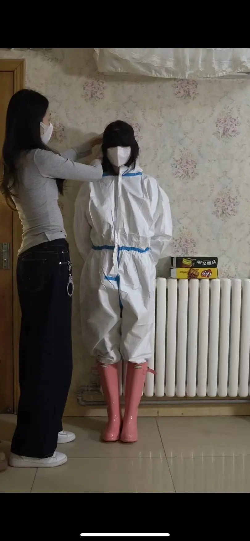 恶女把打扫卫生的工人铐住双手蒙上眼睛,钥匙藏在对方的靴子里,让她们找到钥匙挣脱出来