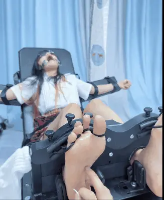 1.模特服装jk格子裙。用螺丝把足枷固定在刑床上。固定好模特。此时模特戴口罩无眼罩,穿白袜,不固定脚趾。