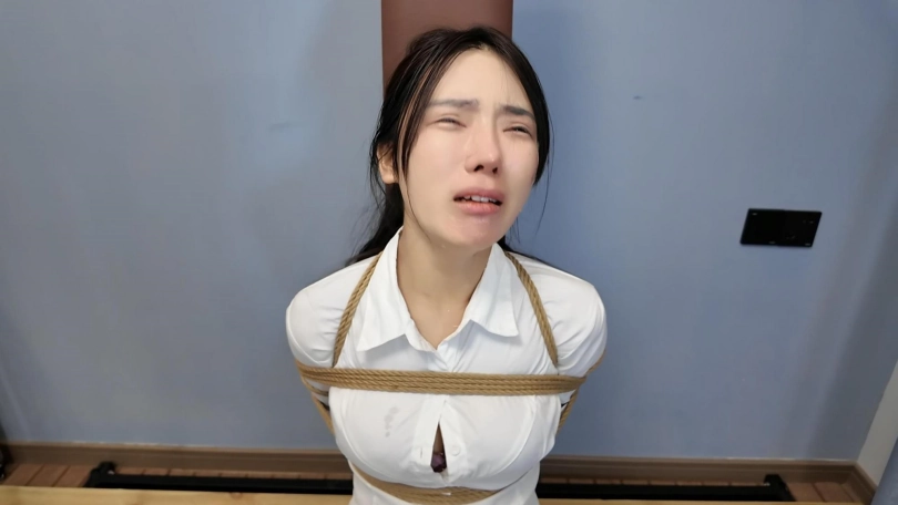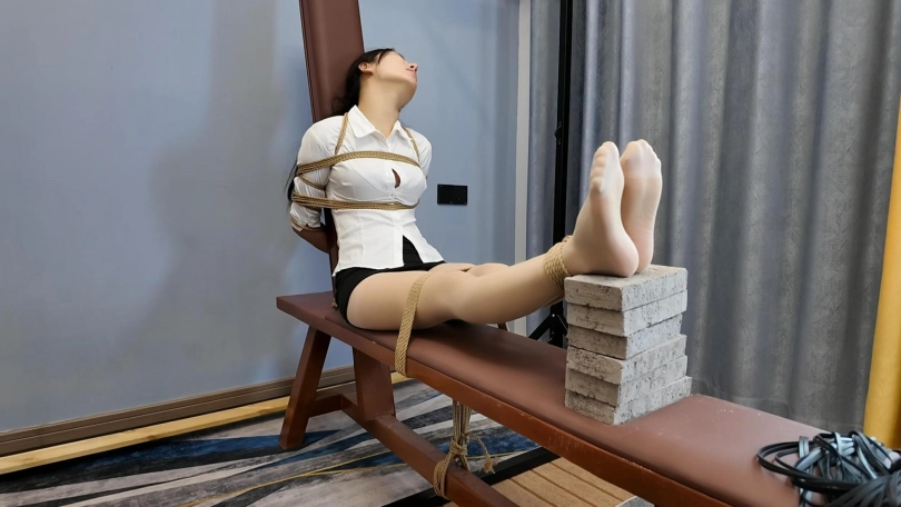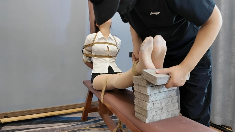 客户要求必须加七块砖,并且要求必须给十一虐哭,事先没有给十一说客户的特殊要求,先哄上老虎凳,绑上再说,一块一块的加,中间加挠脚心和鞭打,刚开始挠脚心十一笑的可开心了,到第六块砖的时候喊疼,马上就成功了,现在绑着呢,可是由不得她了,继续加,没想到加到七块砖喊疼还是没有哭,用力一按腿,这下可好直接哇哇大哭,赶快特写拍摄,接下来一顿好哄