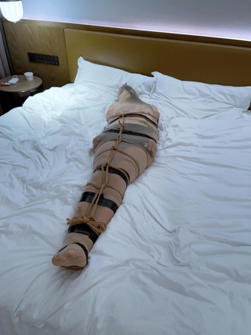 第二层拘束——丝袜全包:用全包丝袜从脚套到头,把被绳子拘束成人棍的糖糖包成丝袜木乃伊~