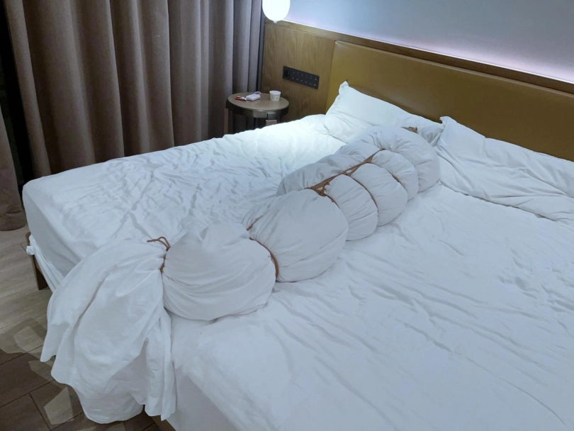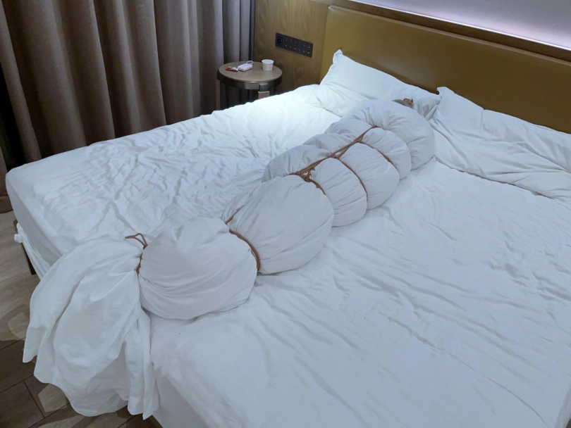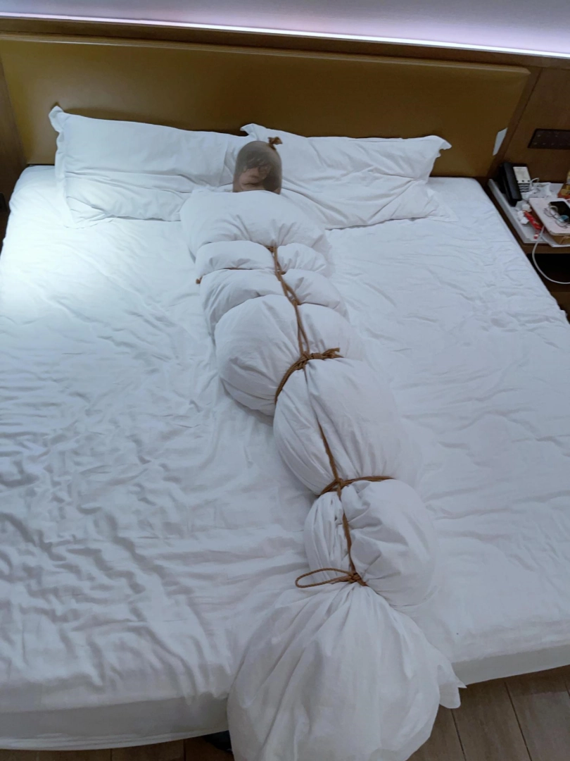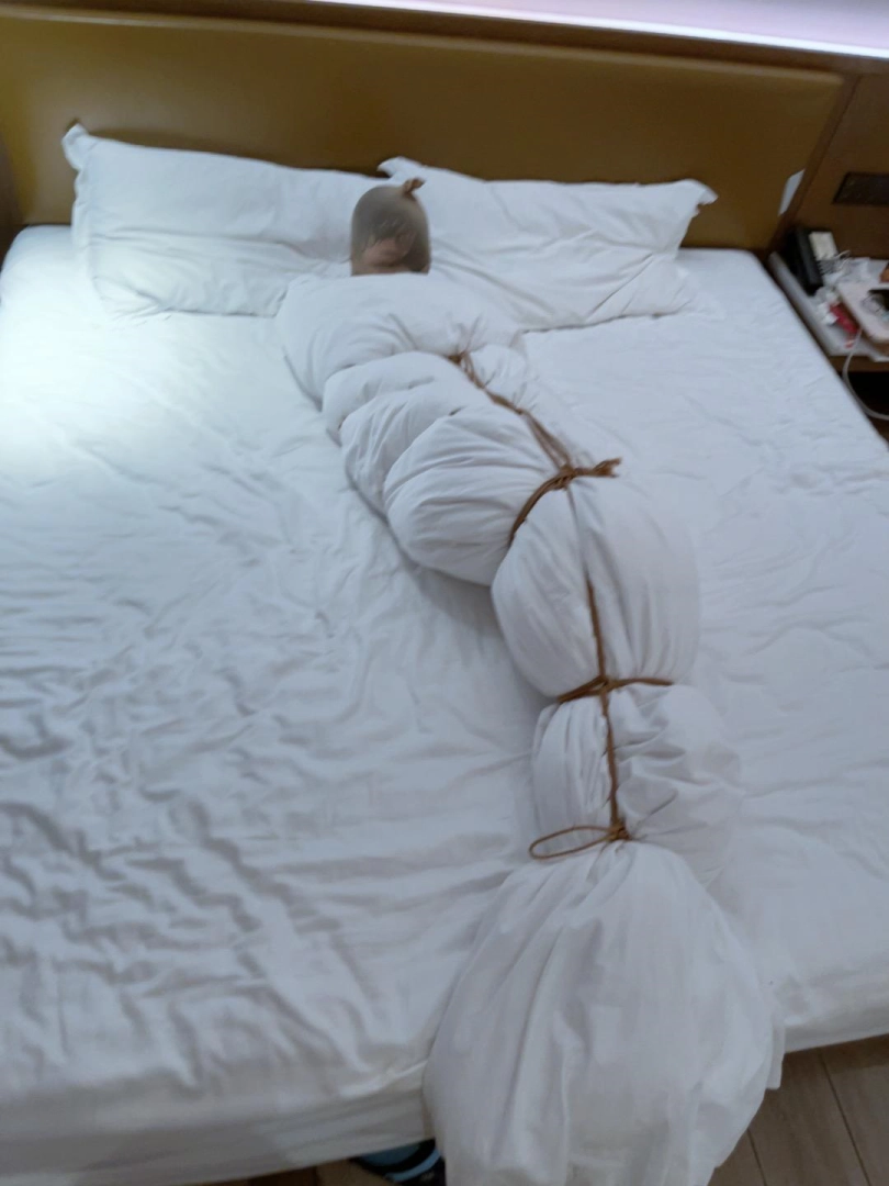 第四层拘束——棉被:把棉被铺开,让妹子躺在上面,然后用棉被卷好裹紧,只露出被丝袜包裹的头部。