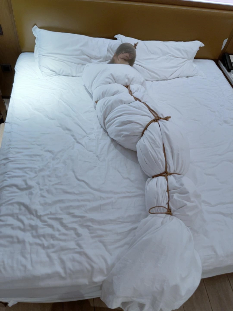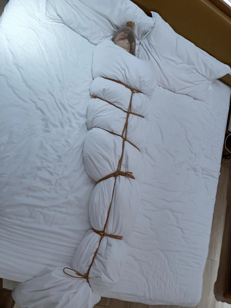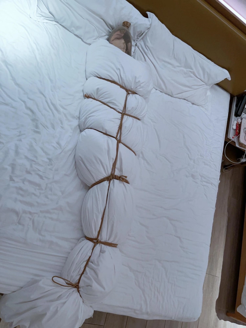 第五层拘束——绳网加固:用6道绳子组成绳网并在脚踝脚腕处打结扎紧。彻底变成棉被毛毛虫!只能蠕动了!