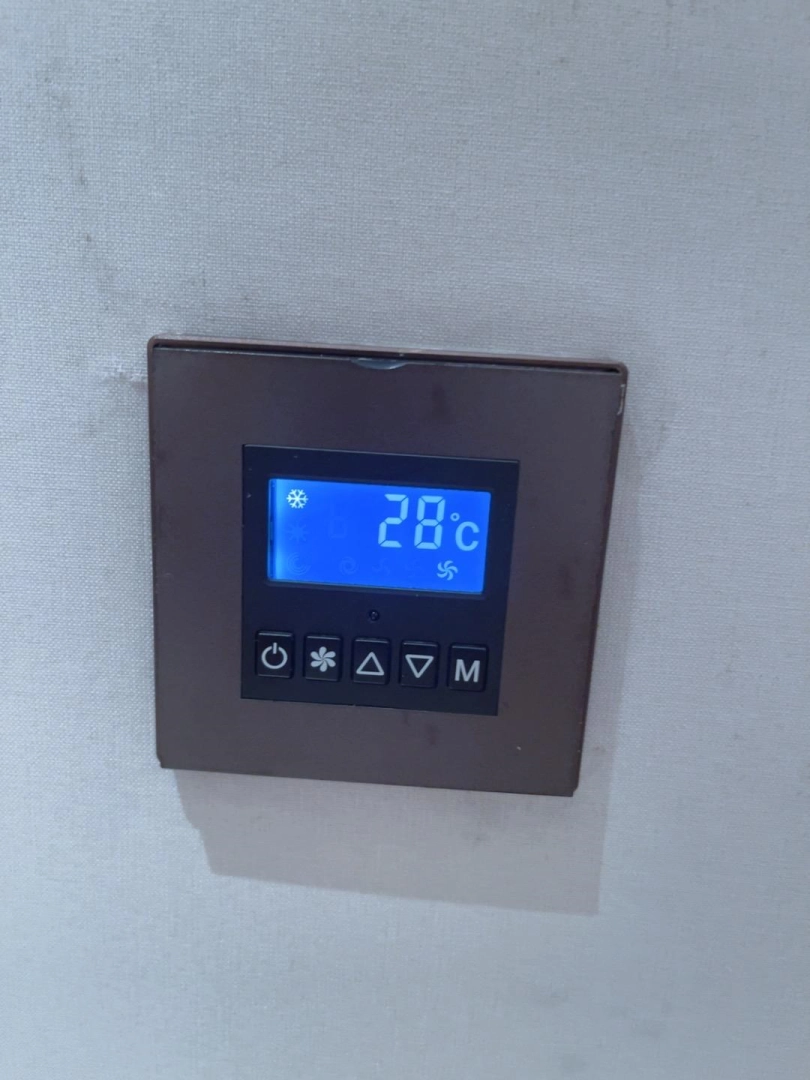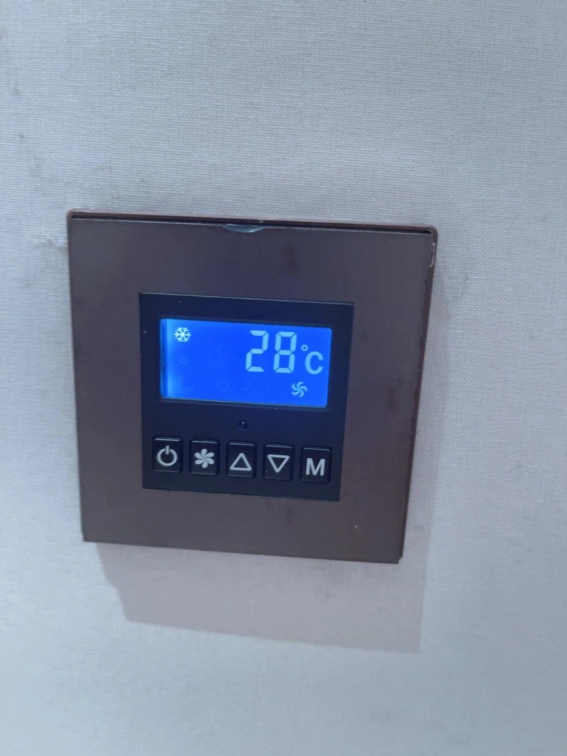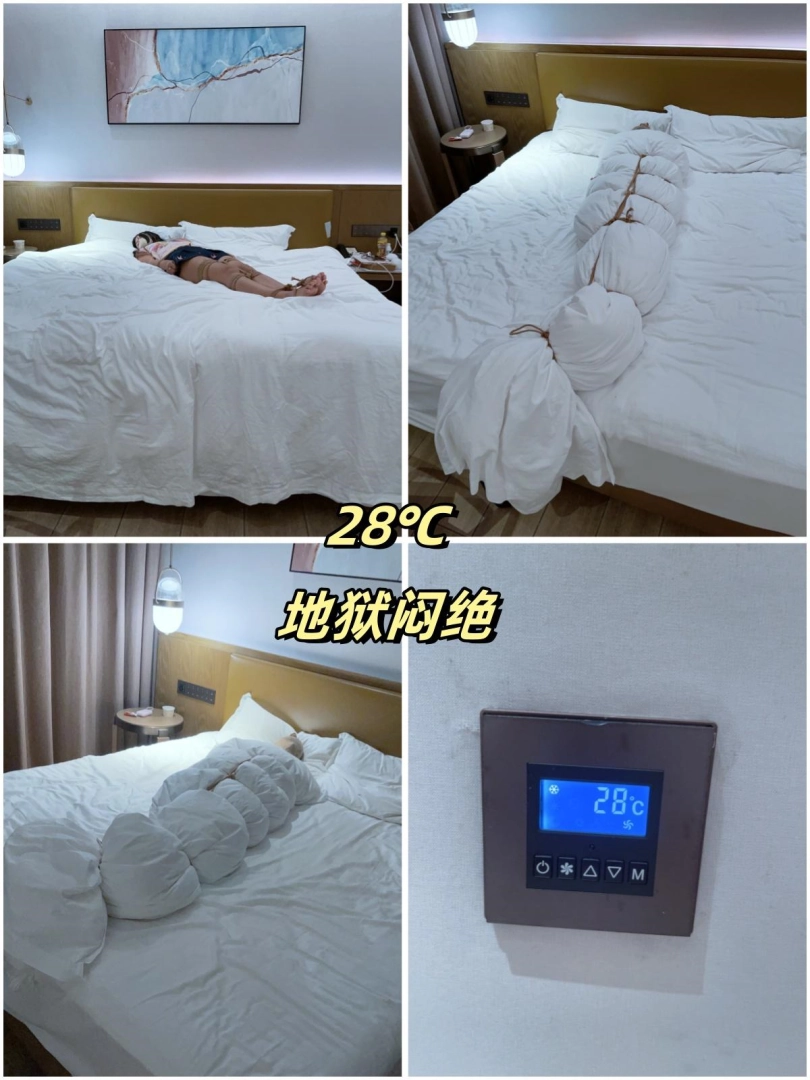 后面开始感到闷热,不断挣扎。随着时间推移气温越来越高——毕竟没开空调嘛。值得一提的是视频中有温度检验环节——先展示妹子被包裹挣扎的镜头,然后打开空调,温度会先显示预设温度,然后显示室内实际气温。也就是先显示25度的预设温度,然后显示室内当前实际气温为28度。这个镜头只是为了展示当前室温,随后空调关闭。