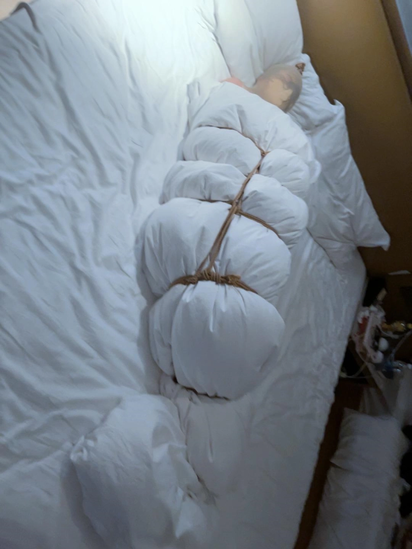 这时妹子已经越来越焦虑了,甚至疯狂挣扎到双手都挣脱了第一层绳子的束缚。不过外面的丝袜、绳子、胶带、棉被还是牢牢固定,只是暂时手腕能动。而且无论里面怎么激烈挣扎外面看都只能来回蠕动而已,最多翻滚。