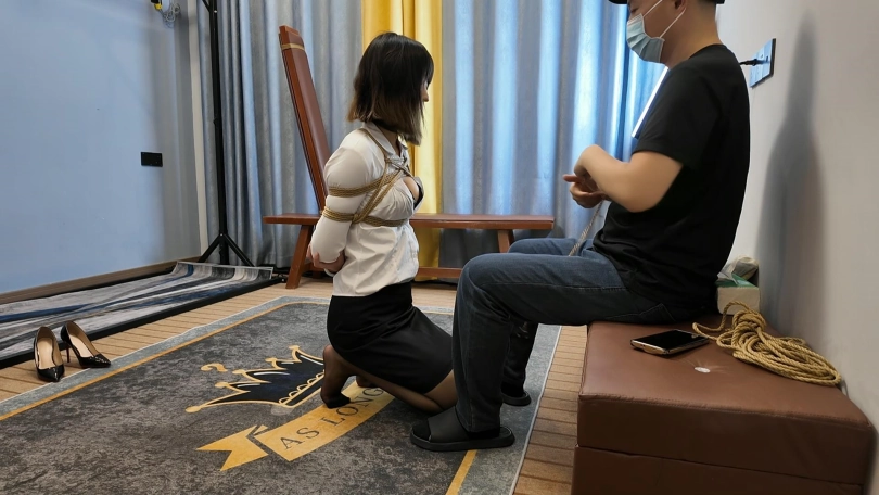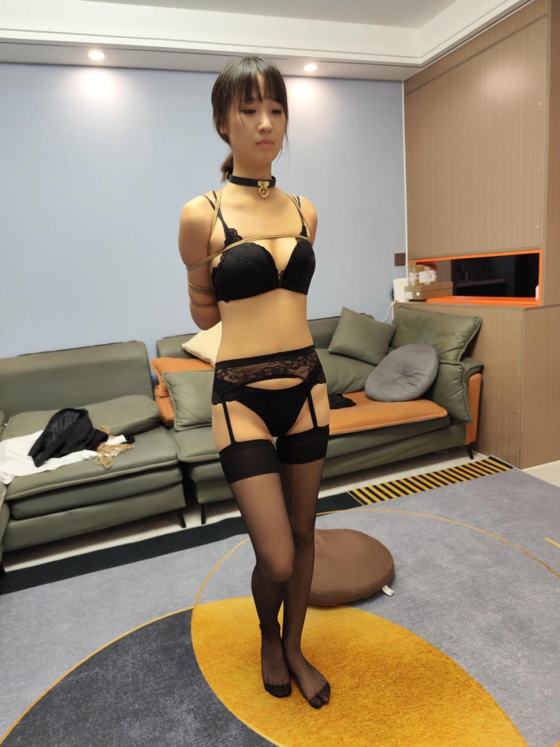 晓倩里面穿上黑色内衣吊带丝袜,外面穿职业装,绑好跪在房间等候,今天等待晓倩的具体是啥样子的体验内容呢?