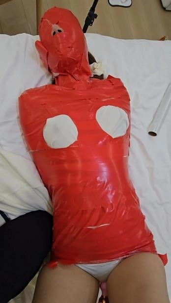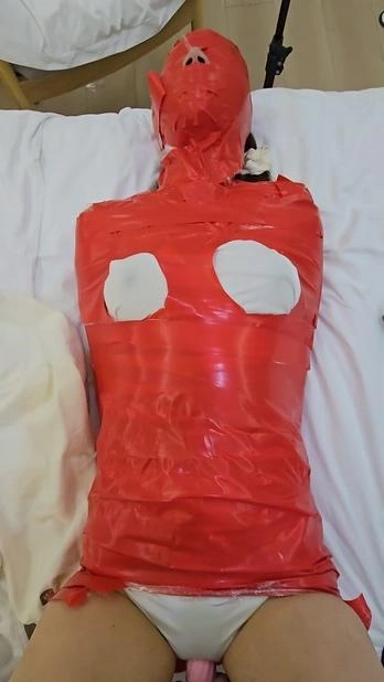› 【小黑】胶带全包木乃伊,各种挑逗,真实对话,还有呼吸玩法,把胸口剪开,没穿内衣,乳头清晰可见,震动高潮,振到受不了。