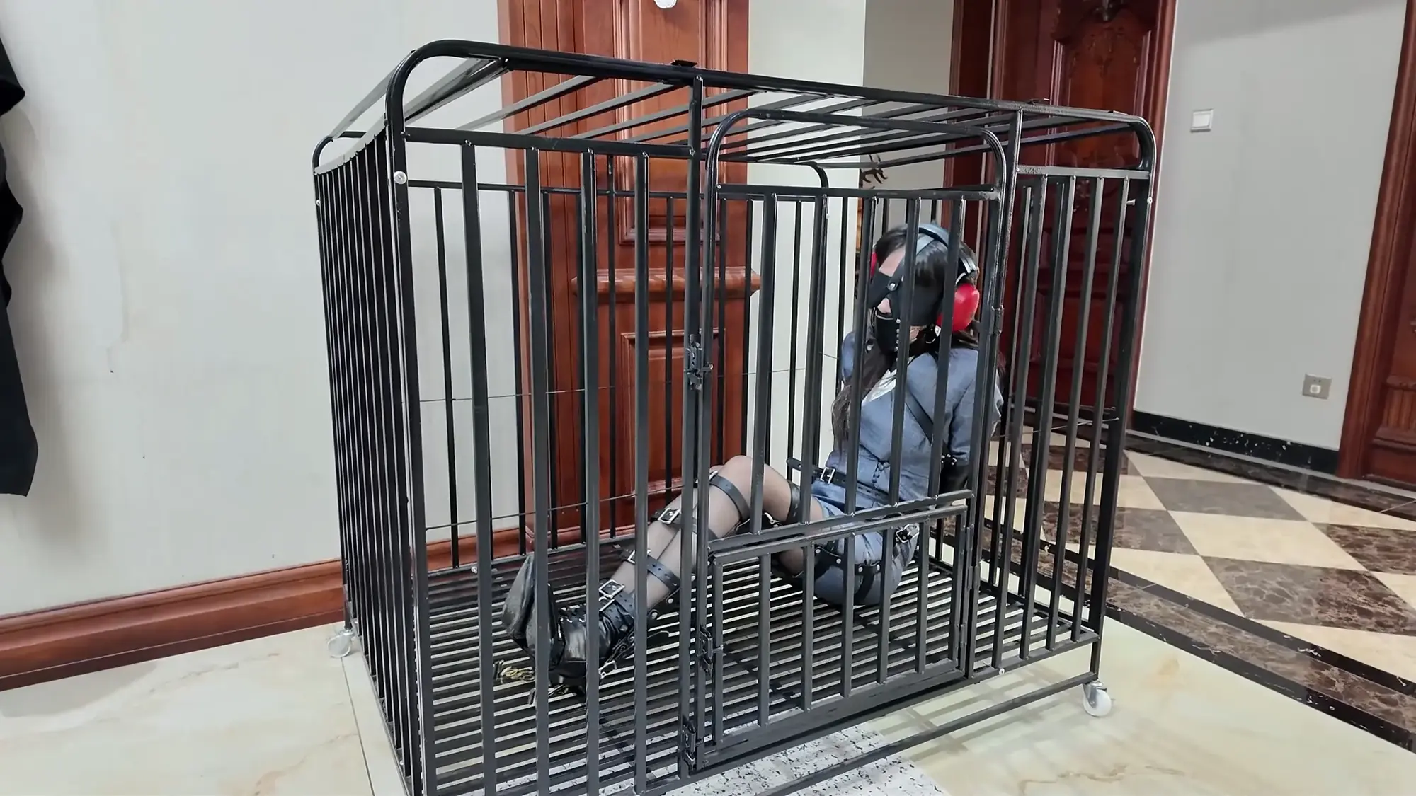 上去了之后,老板说:请我们亲爱的卉萱小姐进去休息一下吧,并指了指面前的笼子,卉萱瞪大了眼,这哪是床,明明是软禁她的囚笼,但是可由不得她,老板给她的腿绑上了最严密的束腿装置。防止她逃跑,然后就粗暴的塞进笼子里。卉萱靠在冰冷的金属栏杆上,试图撞开笼子,金属发出轻微的声响,但是门锁非常牢固,同时眼睛看不见,耳朵也听不见,只能不停的发出呜呜呜的声音,希望有人救她依旧是皮带,类拘束衣束缚,这次的捆绑方式应该是很少见的,却可以出色的完成,可见其实力