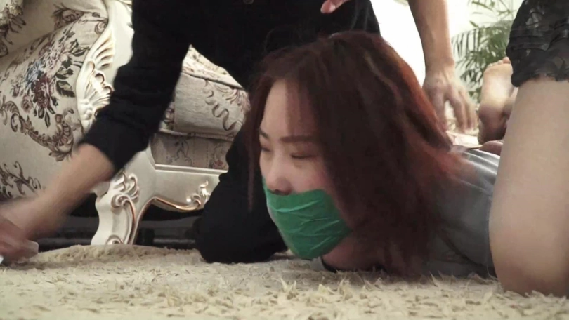 (夏炎与锁哥把想逃跑求救的梁静抓回来,捆成驷马放置在沙发前地上)