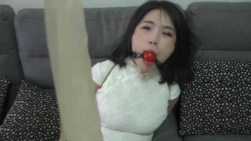 旗袍美女晓璐从昏迷中醒来,发现自己双手反绑,脚踝也被并拢捆绑着。