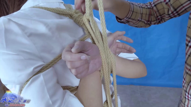 美女被紧紧的后高手高手捆绑,脚尖顶地很严厉那种,因为所有的重量都在脚尖和胯下股绳!股绳还特意加了一个结很大的结这个所有的重量和绳子的连接都在这个结上并且连着起吊机上升,最后 脚尖顶地,只要一放松脚尖股绳勒着就会非常的疼。
