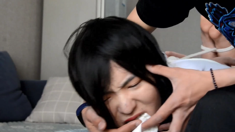 劫匪将小楠五花大绑,捆成驷马,脱掉小楠脚上的白色锦纶丝袜,“挣扎了半天,出了不少汗吧!”拽出小楠口中的内裤,把这双原味白色锦纶丝袜一只只塞入小楠的口中,塞得小楠表情痛苦。