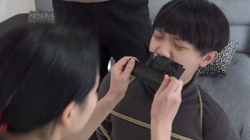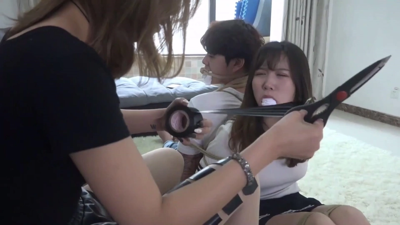 片段4:美女阿桃与男友得罪孙甜,被孙甜捆绑折磨,孙甜为了报复这对小情侣,用自己穿过没洗的一条黑色连裤丝袜塞阿桃嘴里,再脱掉阿桃脚上穿的一双白色棉袜塞到阿桃男友嘴里,给二人用黑胶布与黑色自粘绷带缠绕封嘴,封堵得严严实实。
