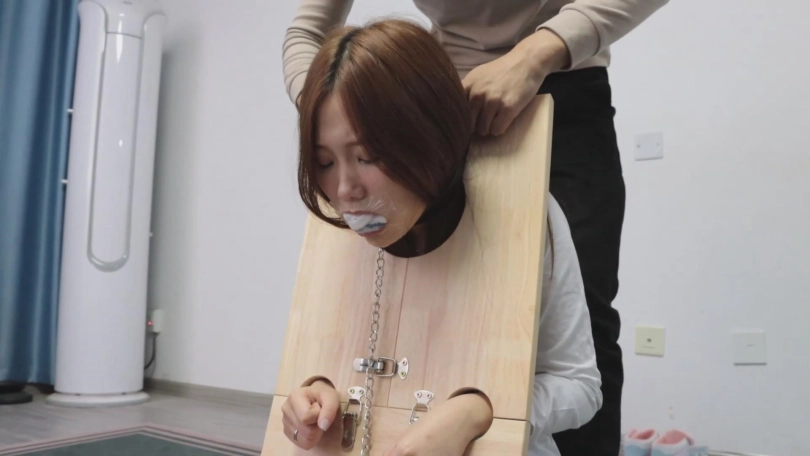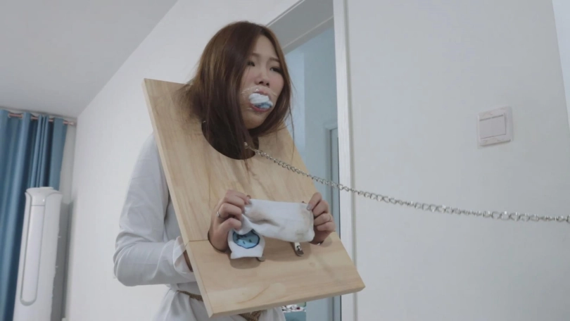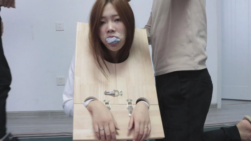 紧接着,代表囚犯身份的木枷被抬了上来,被戴上木枷的犯人更加清楚了自己的处境,她被告知要带着木枷和脚镣进行游街!当然了,嘴里还需要塞着自己的原味棉袜,不仅如此,她必须将另一只原味棉袜的脏袜底用手展示出来。