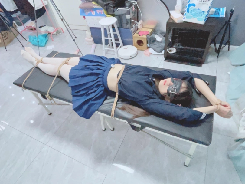 把糖糖双手举高,固定在刑床上,并且在脚腕、大腿,腰腹、手腕分别加固,和刑床牢牢固定在一起。