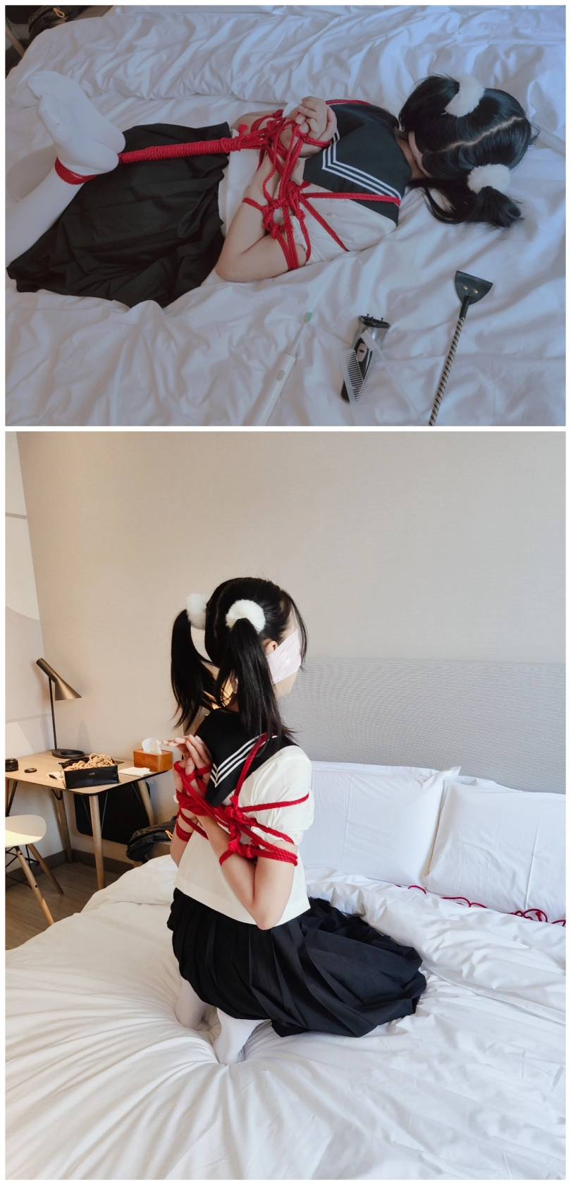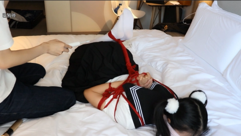 本期准备了六种生活中常见的TK工具:手指、梳子、牙刷、电动牙刷、电动牙刷马达、电动剃须刀的电动旋钮。我们会将穿着jk制服和白丝的双马尾少女用后手观音+驷马的方式紧缚起来,然后依次测试以上各种挠痒道具的效果: