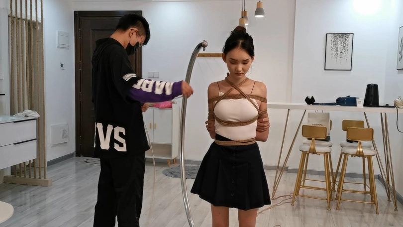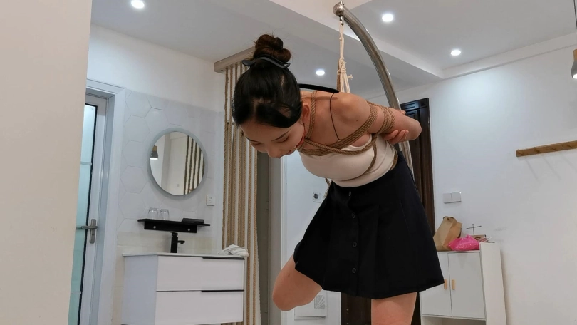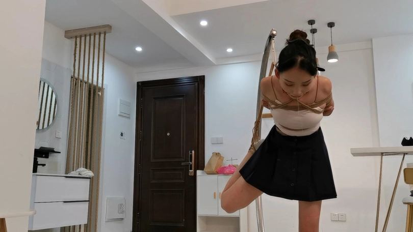 大家喜欢的果果,身穿白色上衣和黑色短裙搭配,身材非常棒,也辛苦了绳师和果果,半吊绑口水不断流下了,还用杯子接着