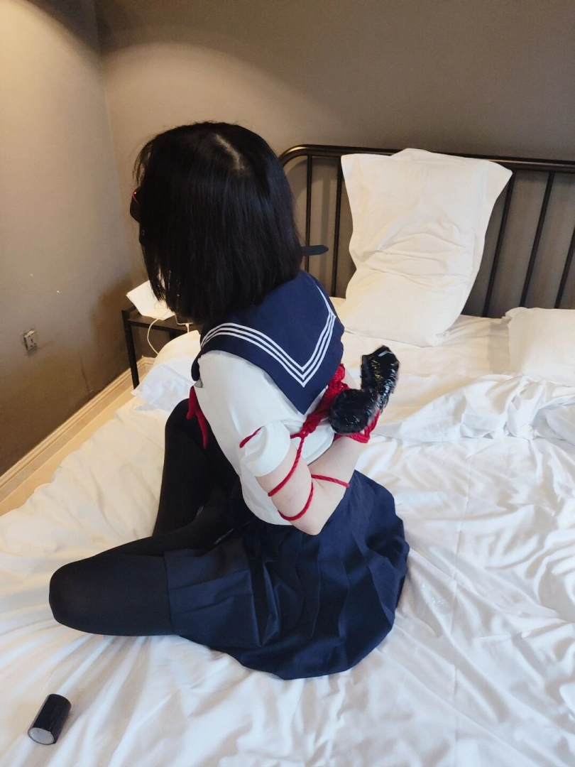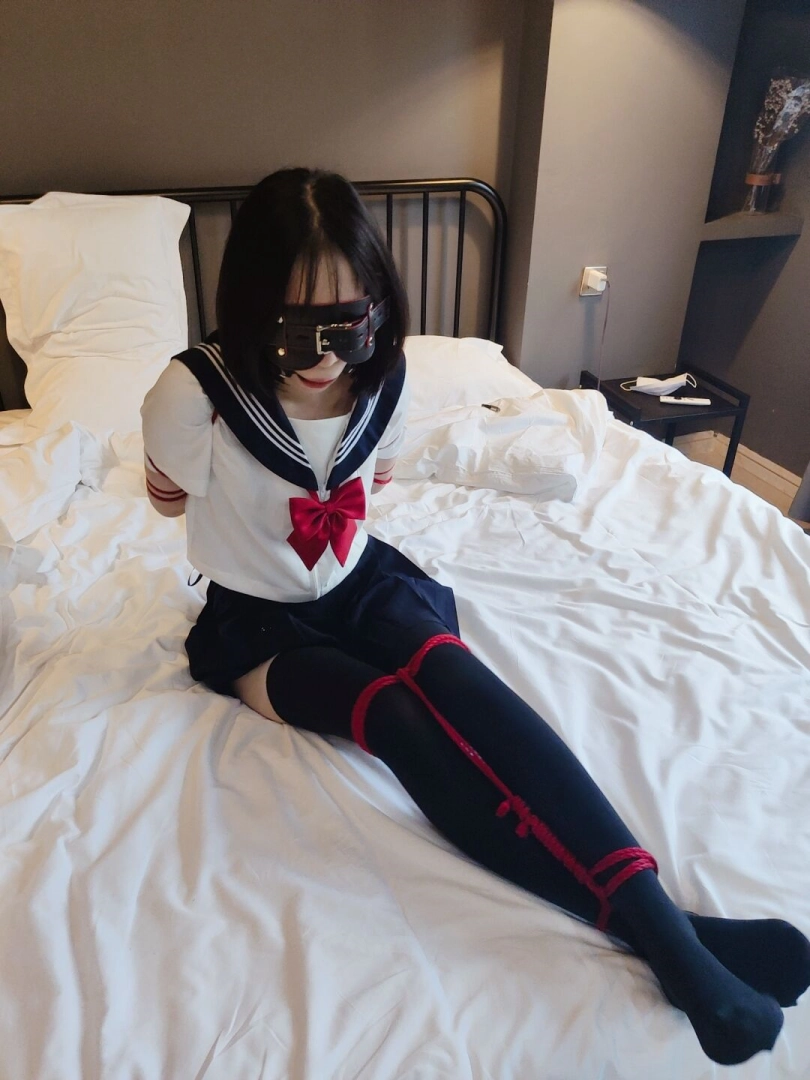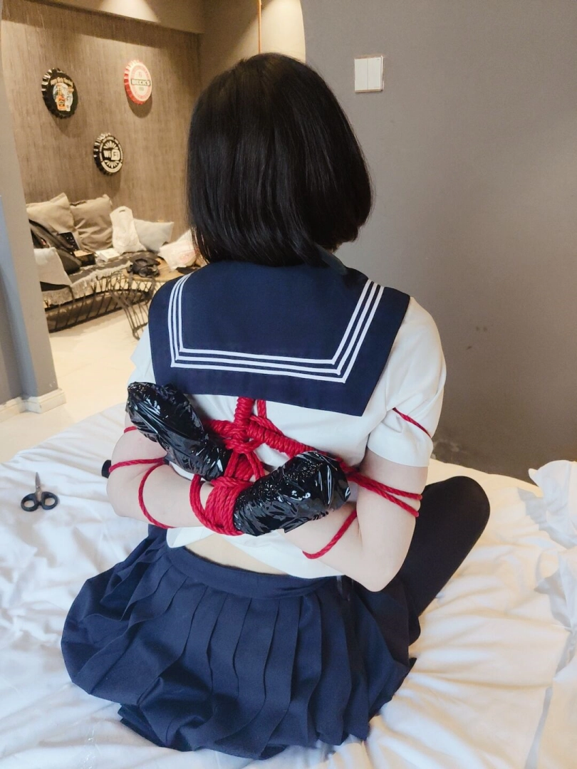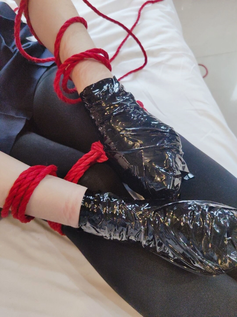 期间将双腿也折叠起来绑在一起,增加脱缚难度。