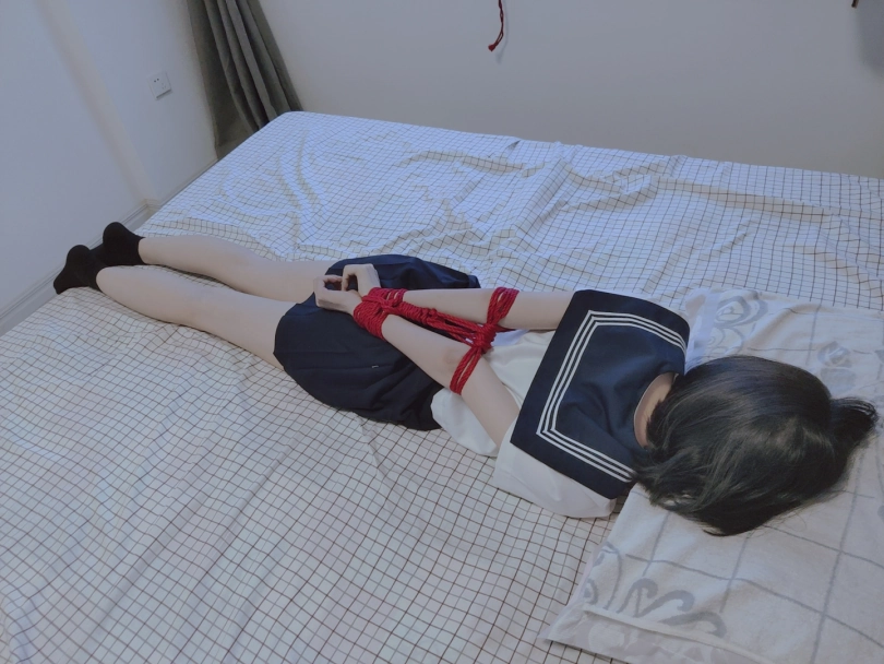 迷晕后将少女的双手严厉的直臂反绑,踢蹬的很欢实的黑色短袜小脚也并拢绑住。