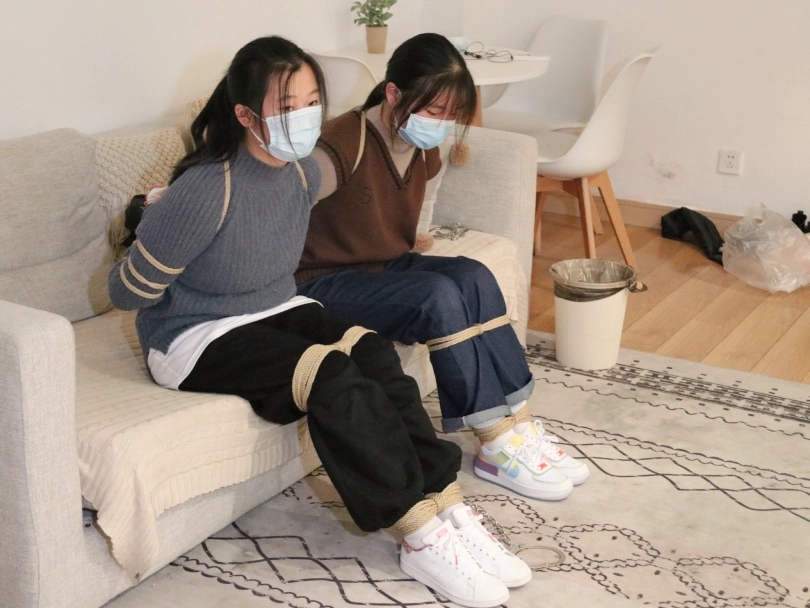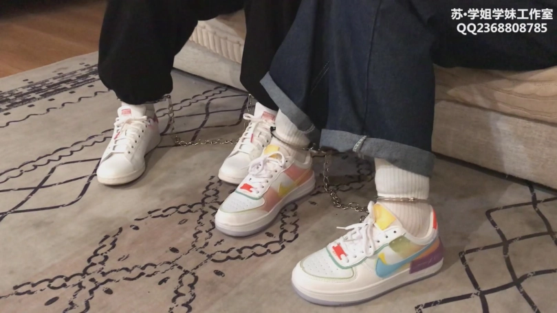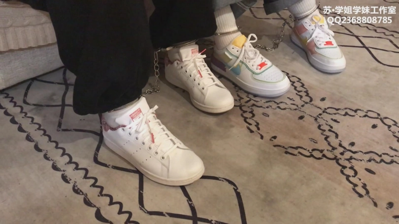 两个可爱的中学生小姐妹一起来试镜,初次体验捆绑。两人刚来的时候超级紧张,站在门口一直往里望,拉着手不赶进来。进来一套五花之后,两人都放松了下来,开始坐在一起被绑着聊天。其中一个练过舞蹈,柔韧性超好,极限驷马不在话下。另一个小时候玩过家人的手铐,把小伙伴铐起来结果解不开了,还被大人打了一顿。五花+超紧驷马+戴镣下跪+戴镣行走,白鞋白袜。(耐克空军板鞋和阿迪stan smith)
