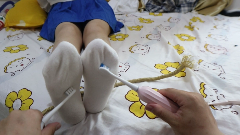店员见状,笑了笑说:“你的脚趾挺敏感的啊,很怕痒嘛,那我们今天就主要挠你脚趾了哦”说完,转身拿个了牙刷在她脚趾上刷起来。脚趾,脚趾缝一个都没落下,一点一点的细细的挠了个遍。然后,店员用手扳住她的脚趾,拿起了大刷子狠狠的刷着她的脚底和前脚掌。